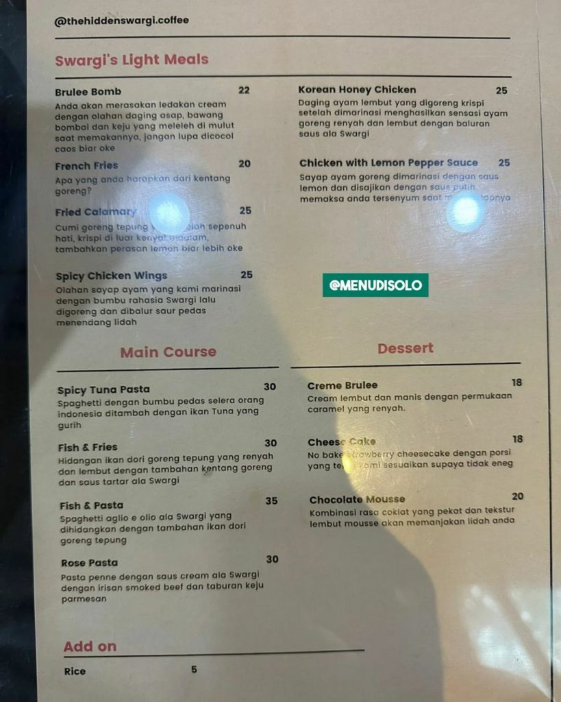 BukuMenuSolo.com – Sarapan, makan siang, makan malam? Makan enak di Solo yuk. Mencoba ragam kuliner favorit di Solo dan sekitar. Kamu fans berat kuliner tempat makan enak di Solo? Bingung mencari daftar harga menu kuliner Solo lengkap? Kamu harus simak info buku menu di Solo ini..Ada update Buku Menu Solo hari ini, kamu harus tau, Buku Harga Menu The Hidden Swargi Coffee Solo…