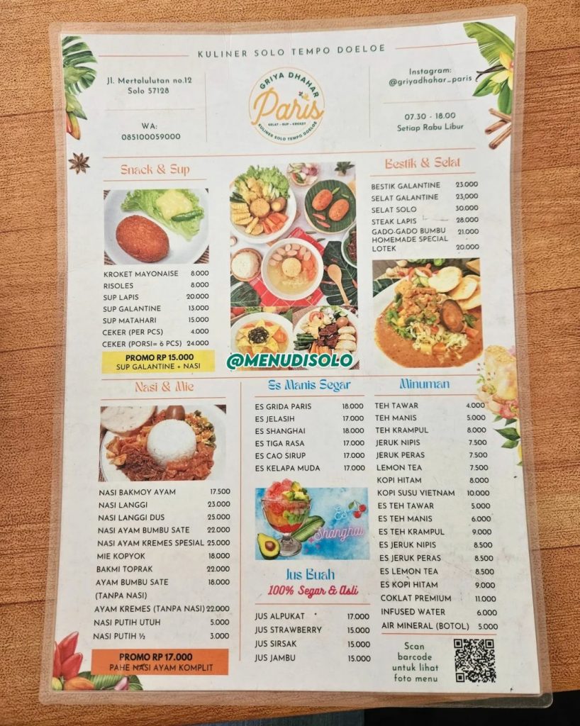 BukuMenuSolo.com – Sarapan, makan siang, makan malam? Makan enak di Solo yuk. Mencoba ragam kuliner favorit di Solo dan sekitar. Kamu fans berat kuliner tempat makan enak di Solo? Bingung mencari daftar harga menu kuliner Solo lengkap? Kamu harus simak info buku menu di Solo ini..Ada update Buku Menu Solo hari ini, kamu harus tau, Buku Harga Menu Griya Dhahar Paris Solo…