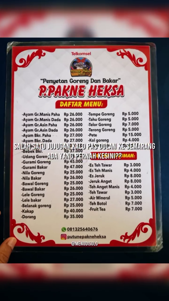 BukuMenuSolo.com – Sarapan, makan siang, makan malam? Makan enak di Solo yuk. Mencoba ragam kuliner favorit di Solo dan sekitar. Kamu fans berat kuliner tempat makan enak di Solo? Bingung mencari daftar harga menu kuliner Solo lengkap? Kamu harus simak info buku menu di Solo ini..Ada update Buku Menu Solo hari ini, kamu harus tau, Buku Harga Menu Penyetan Pakne Heksa di Semarang…
